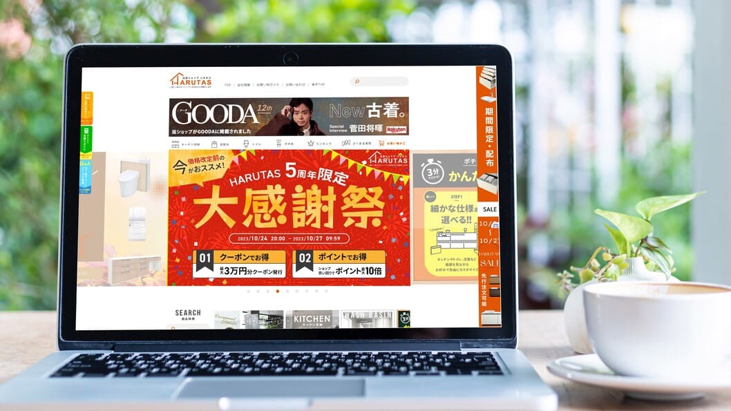 キッチン収納や洗面台などを扱う業者様をターゲットに、5周年記念の「大感謝祭」を盛大に周知し、商品の購入を促すことを目的として制作しました。